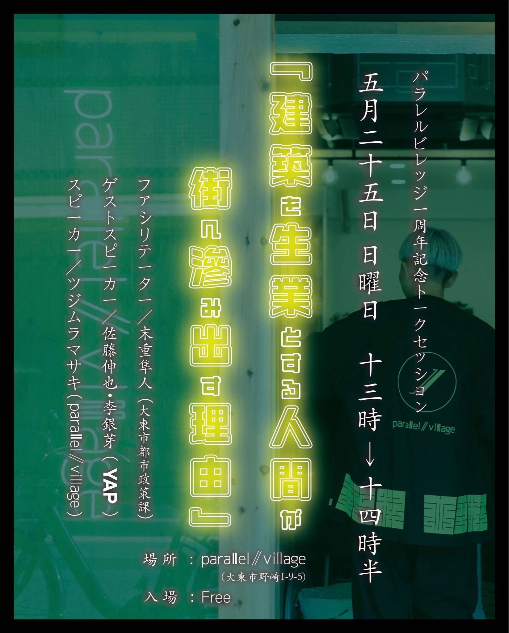 ツジムラマサキ氏が主宰するパラレルビレッジ1周年記念トークセッション「建築を生業とする人間が街に滲み出す理由」に、佐藤伸也と李銀芽がゲストスピーカーとして登壇します。