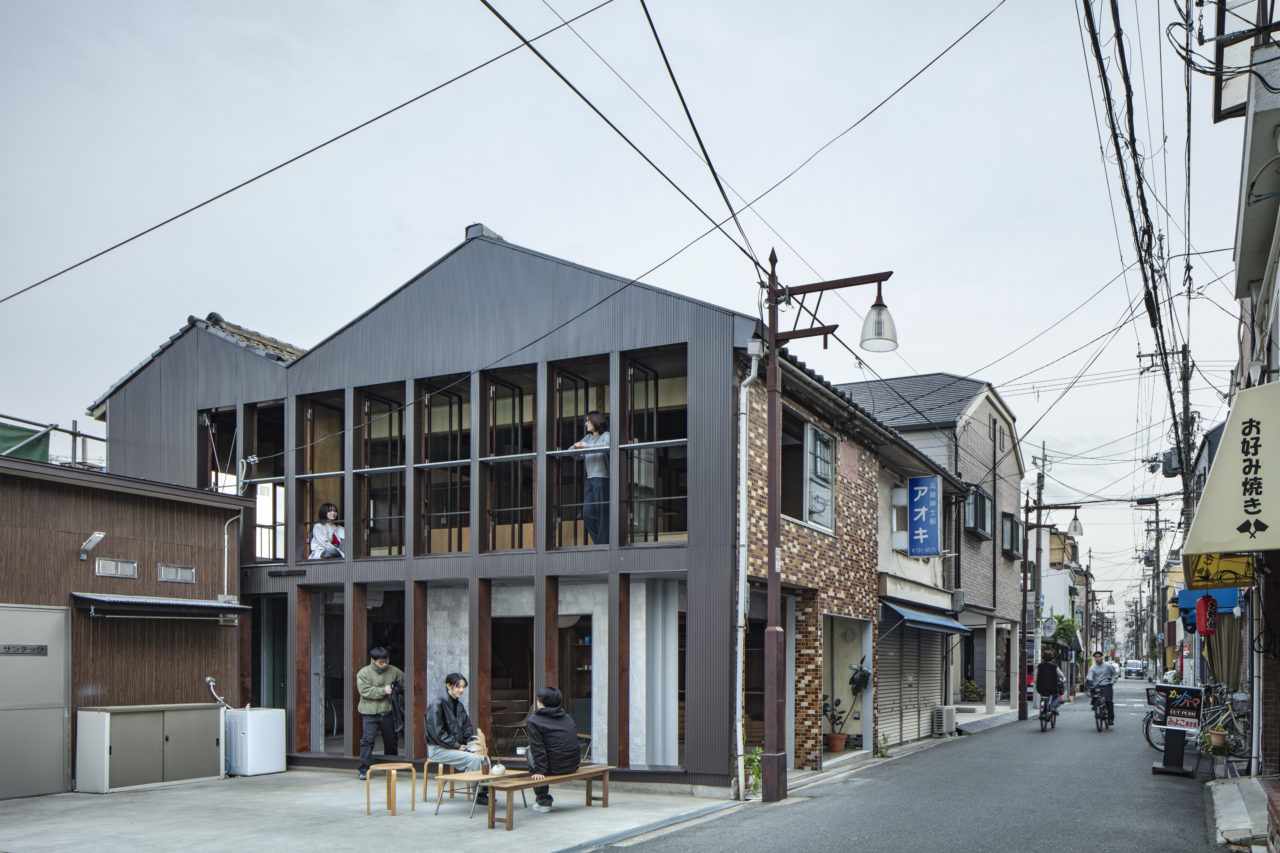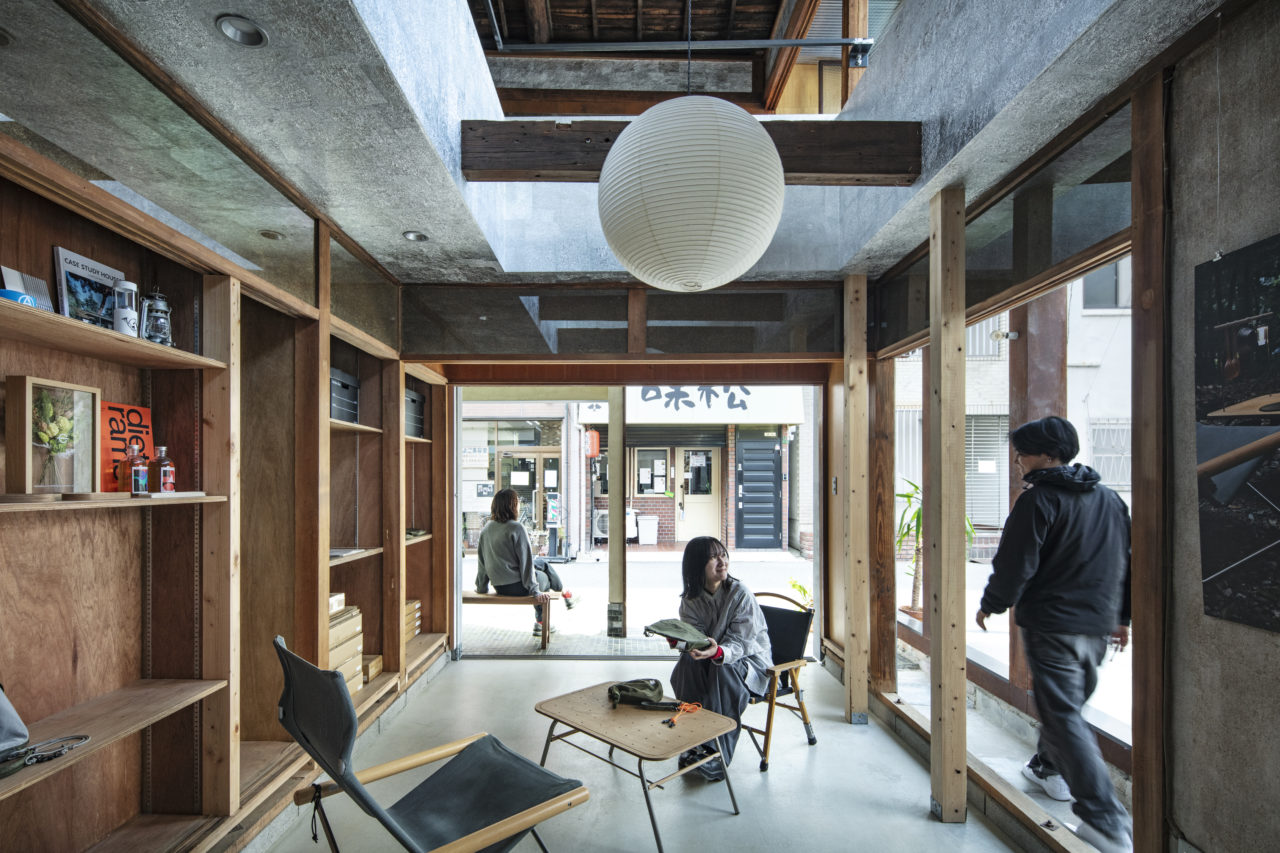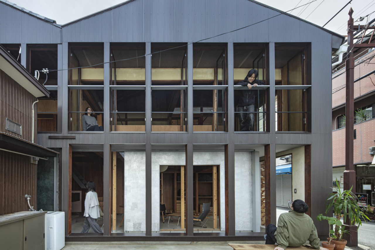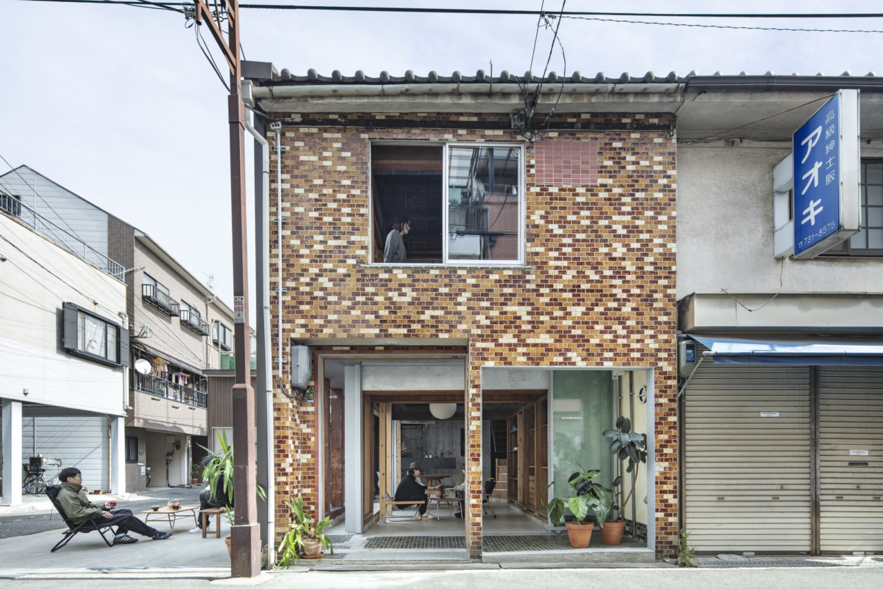 大阪・鶴橋に建つ築103年の二軒長屋の一軒を立ち寄り場にコンバージョンするプロジェクトである。元は3軒長屋だったが、北側が切り離し解体されたため、現在は2軒長屋でその北側1軒である。婦人服の縫製を生業としていた店主とその家族が、1Fを工房、2Fを住宅として利用して、長年、職住一体の生活を営んでいた。しかし高齢を理由に周辺のマンションに移り住み、この建築は空き家化した。