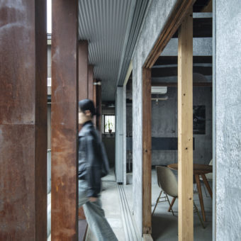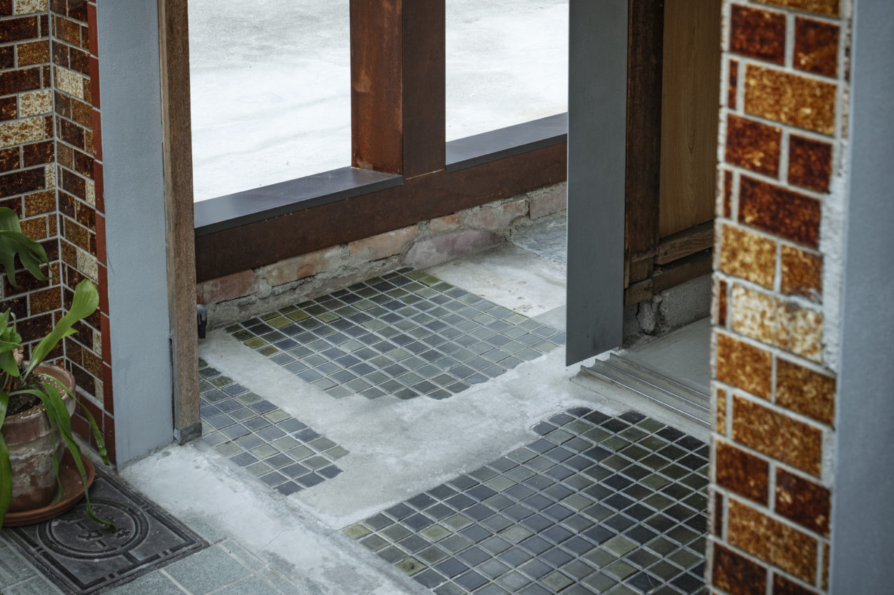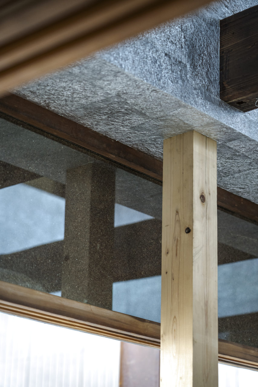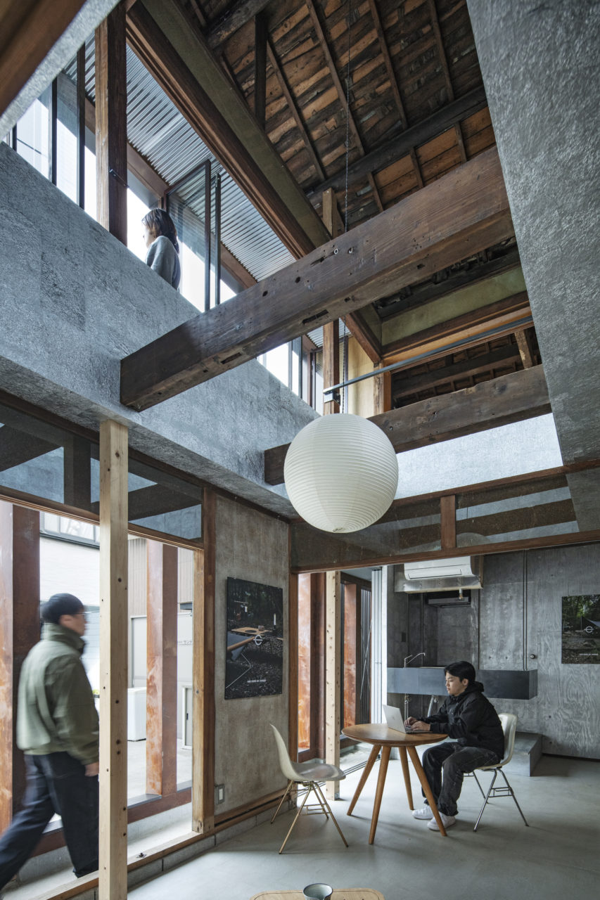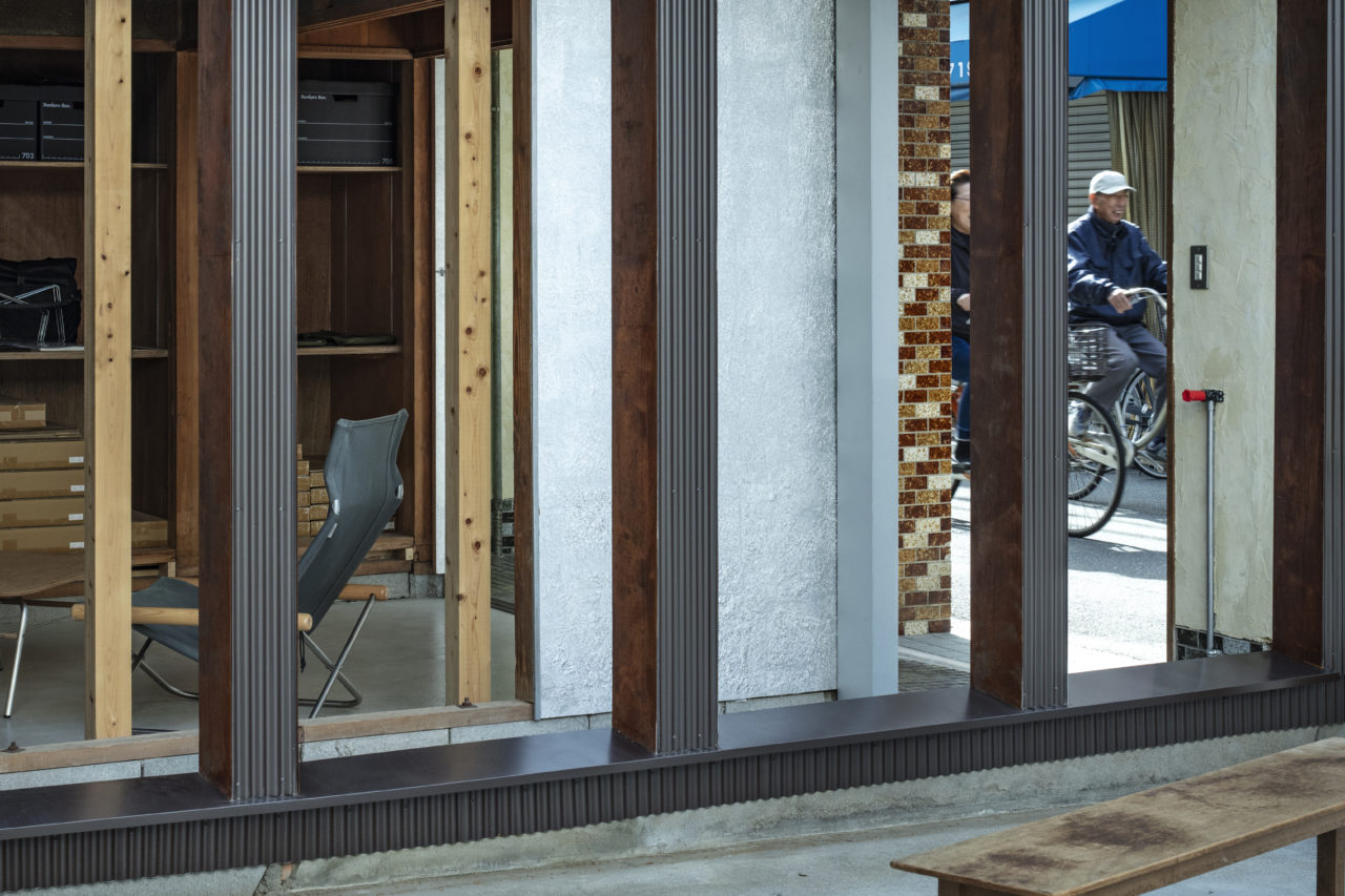 改修前の1Fは道路側を工房として利用しており、すでに公共的な性格を帯びていた。北側には屋内の廊下があり、2Fの住宅部分への動線として機能していた。その性格を残したまま、北側の外壁である界壁を柱を残して解体し、半屋外空間に再設計した。大型スチールサッシを全て開放すると1Fは外部化する。前面道路、北側隣地、立ち寄り場の1Fは一体化され、北側隣地は前庭としての性格を帯び始める。