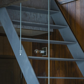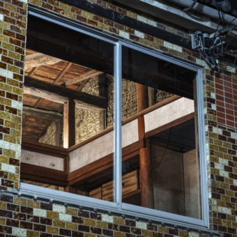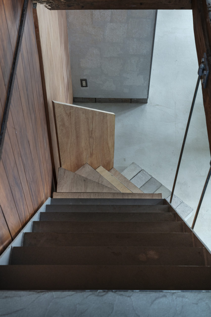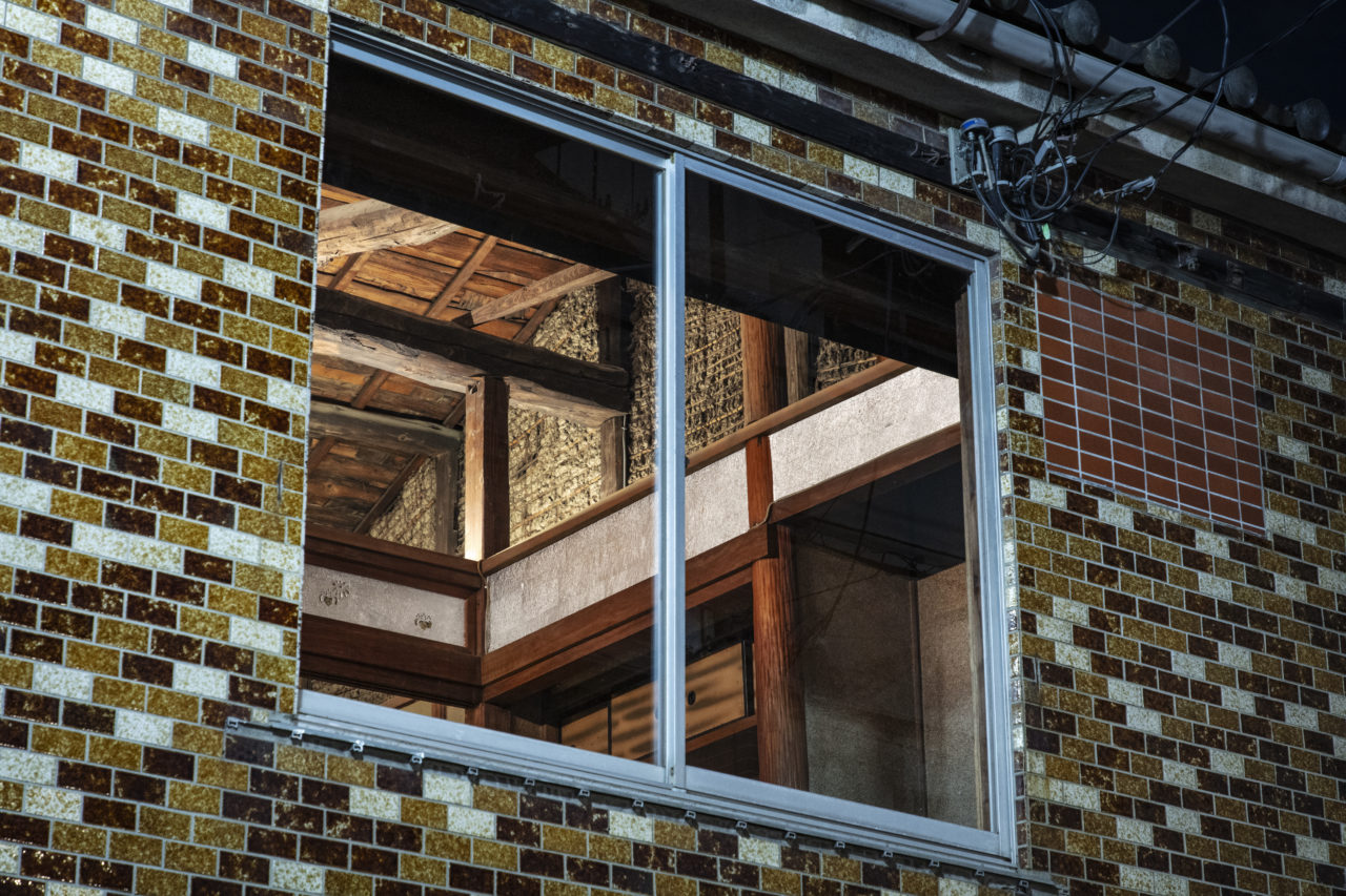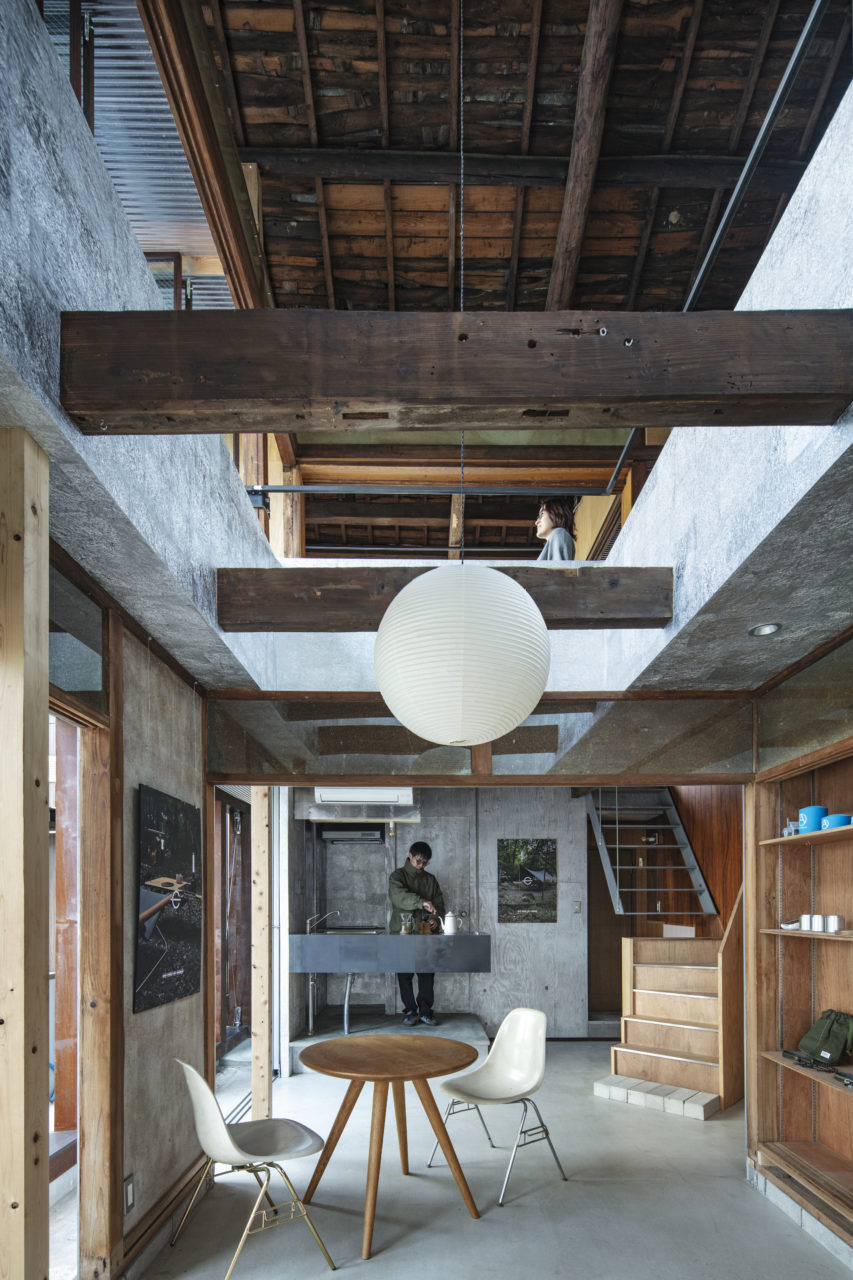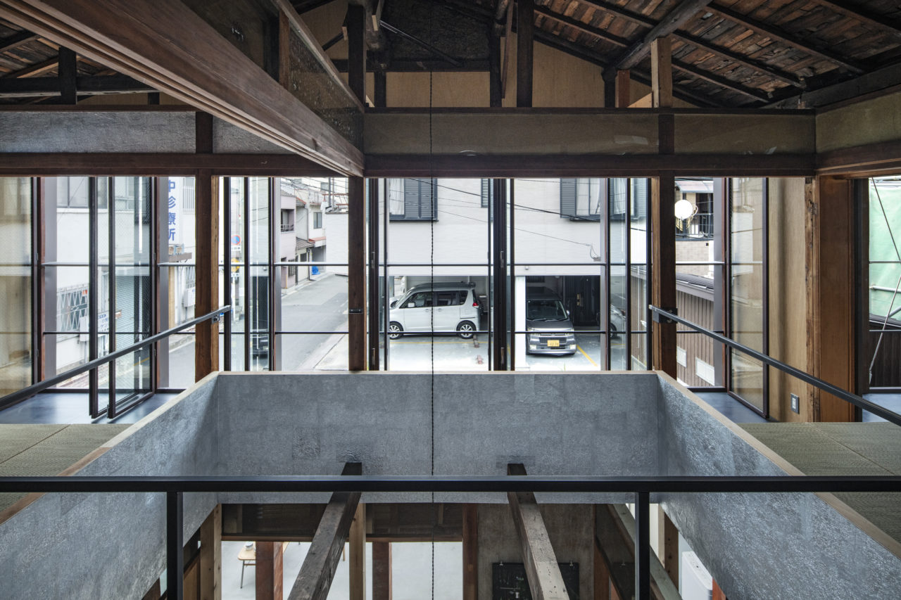 改修前の2Fは、襖で3部屋に仕切られており、北側は押し入れであった。新たに穿たれたファサードに呼応するように、この押し入れを解体し、回遊できるギャラリーへと改修した。明確な機能を持たない2Fは、北側から光を取り入れるための光だまりと、通風のための換気空間として機能する。1Fと2Fを接続する吹き抜けによって、光と風は館全体を回遊する。うなぎの寝床型の奥に長い長屋の断面を露出させることで、誰も見たことがない、しかし確かに存在する内部のアクティビティをファサード化する。